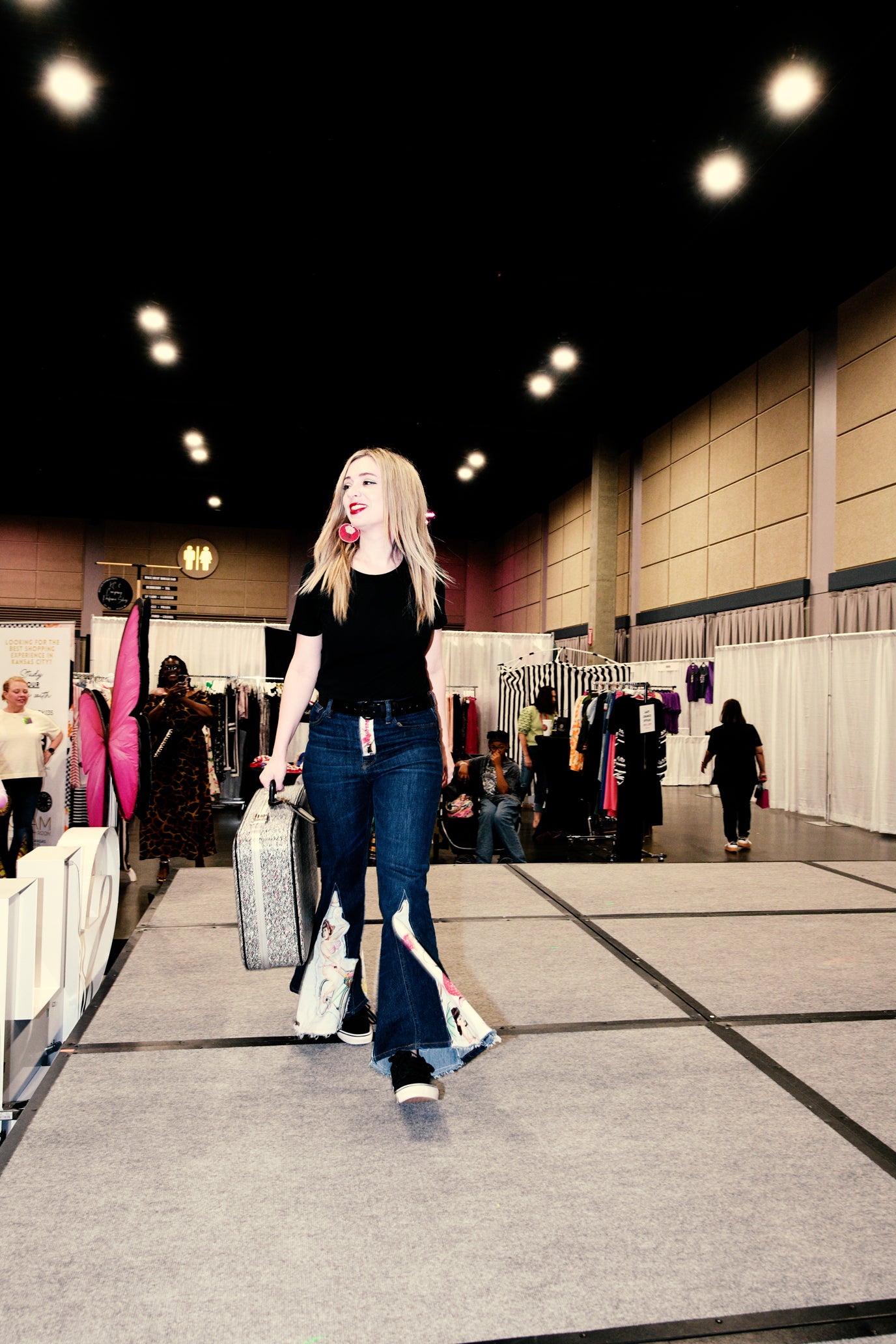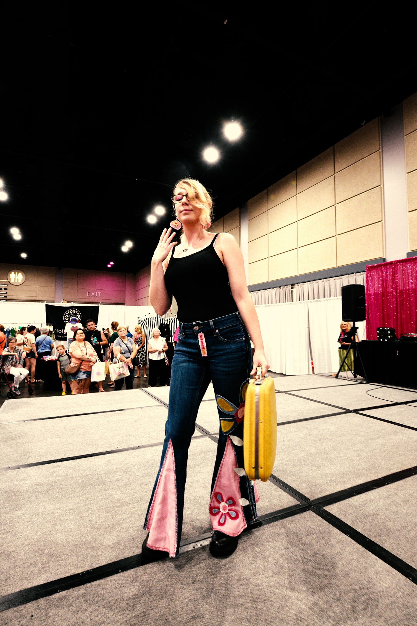 Discover our unique collection of upcycled bell-bottom jeans, featuring bold fabric inserts and appliqué art for a dramatic retro look.
