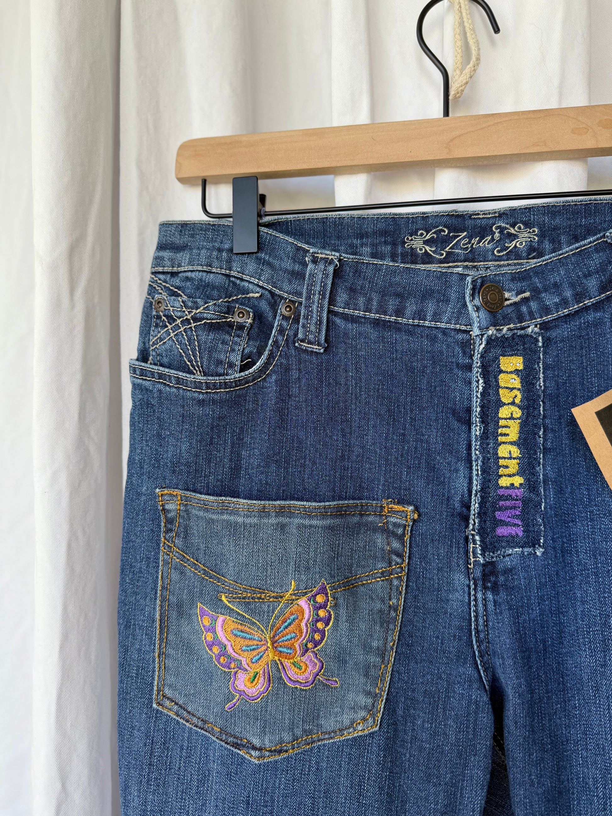 - Embroidered butterfly patches on leg and back pocket