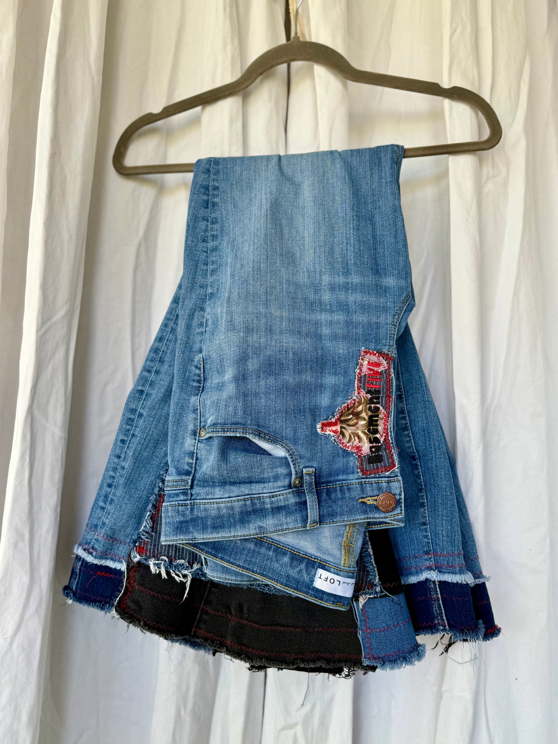 Each pair is created from pre-loved denim, reducing waste and reimagining materials into expressive, wearable art. No two pairs are alike — every piece tells its own story.