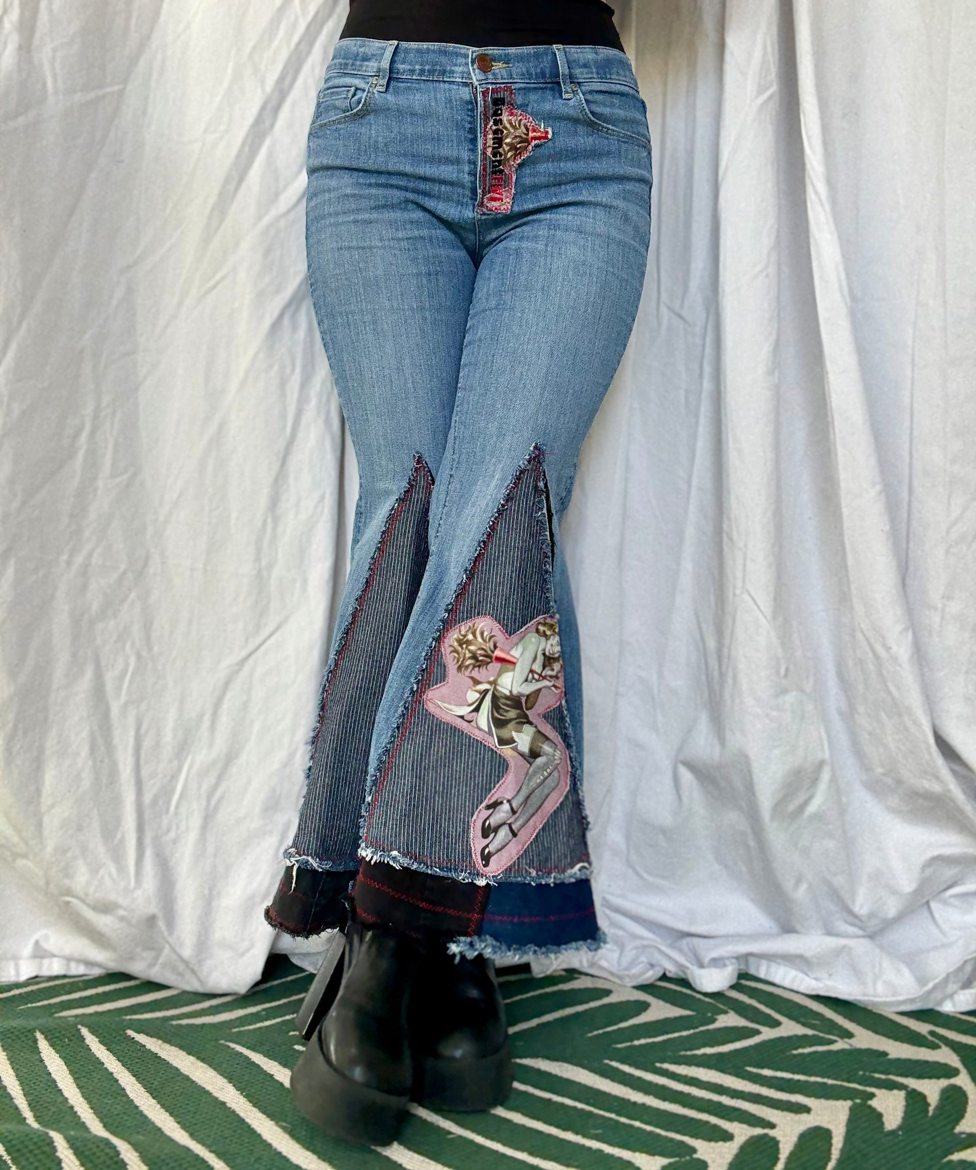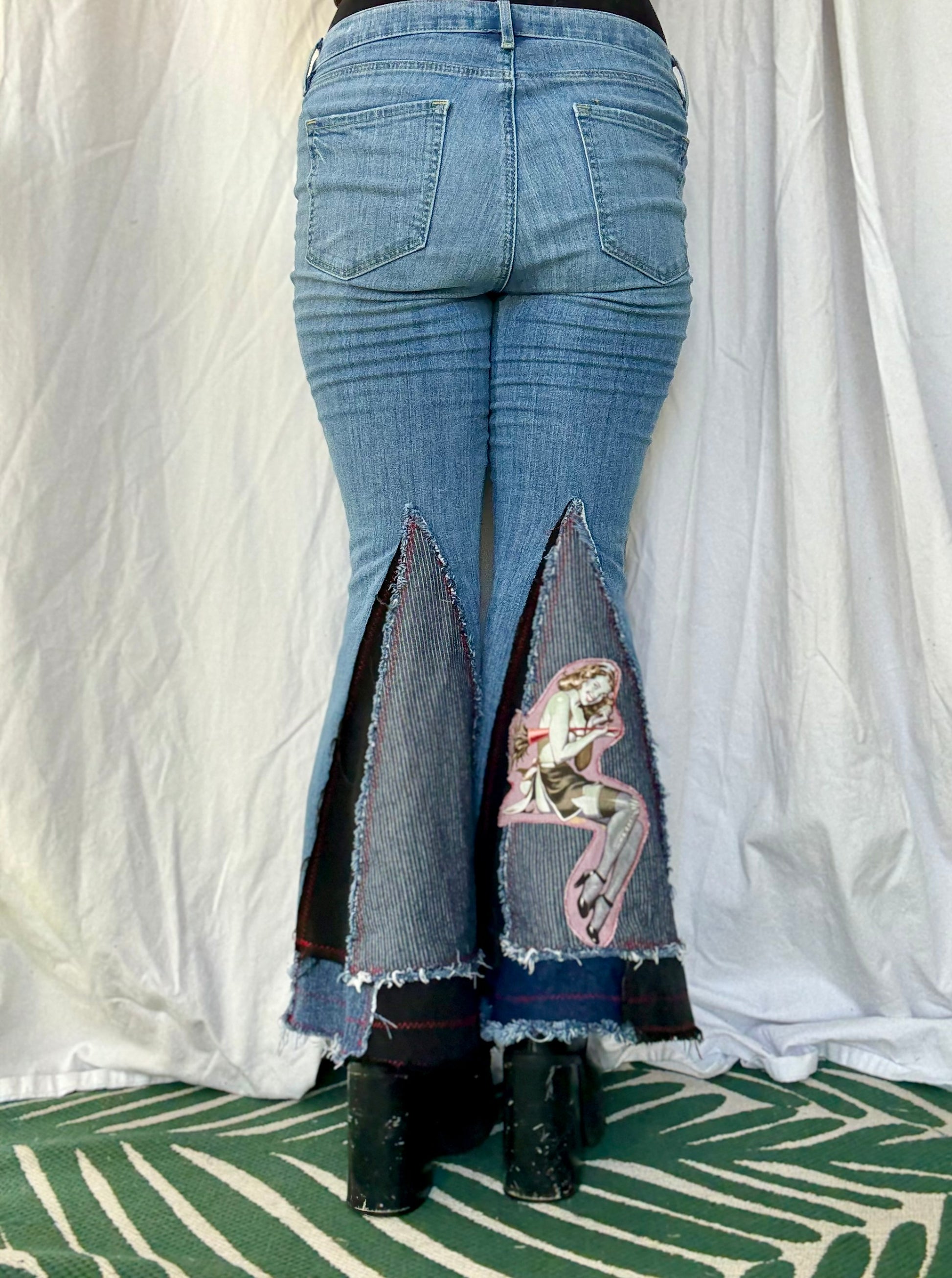 Turn heads in these one-of-a-kind upcycled bell bottom jeans featuring a vintage pin-up appliqué and dramatic layered flare design. The light-wash denim is reimagined with striped and dark denim inserts, exposed seams, raw edges, and contrast stitching for a perfectly undone rock-and-roll look.