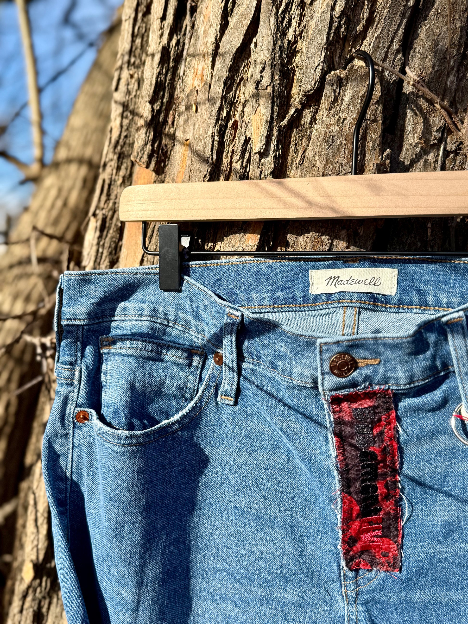 Crafted from upcycled denim, the dramatic flares feature striking red skull print (Alexander Henry fabric) inserts layered beneath raw-edge panels for maximum movement and contrast. A matching red statement detail at the fly adds cohesion and an unexpected pop up top, tying the entire look together. The layered denim hem keeps that handcrafted, deconstructed vibe alive.