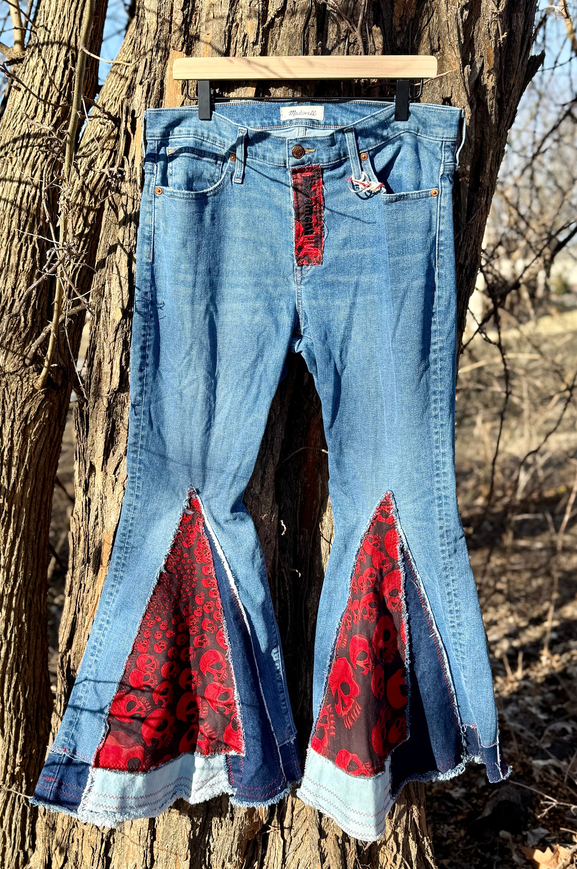 Crimson Skull Patchwork Bell Bottoms (Size 8)