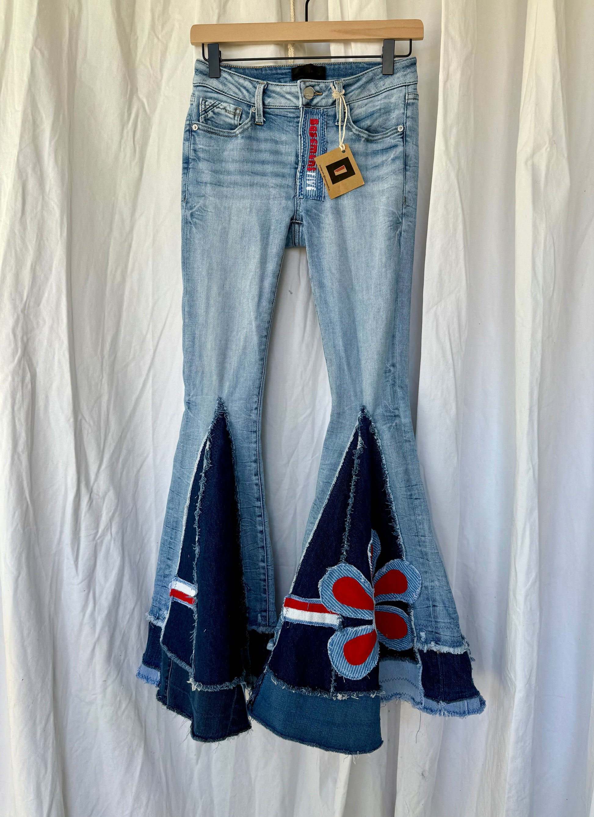 Make a bold statement in these handmade, upcycled bell-bottom jeans featuring a striking red and navy flower appliqué design. The light-wash denim base is paired with layered dark denim flare inserts, raw frayed edges, and playful contrast stitching — giving these jeans a retro, one-of-a-kind edge.