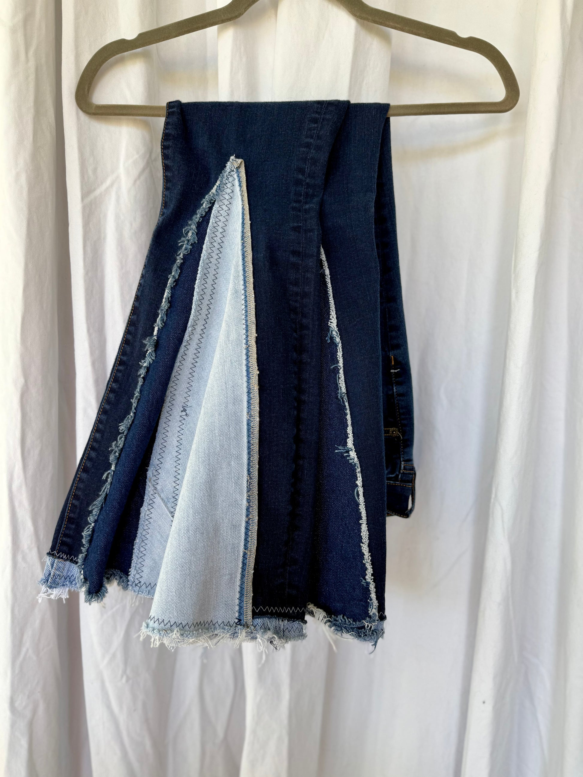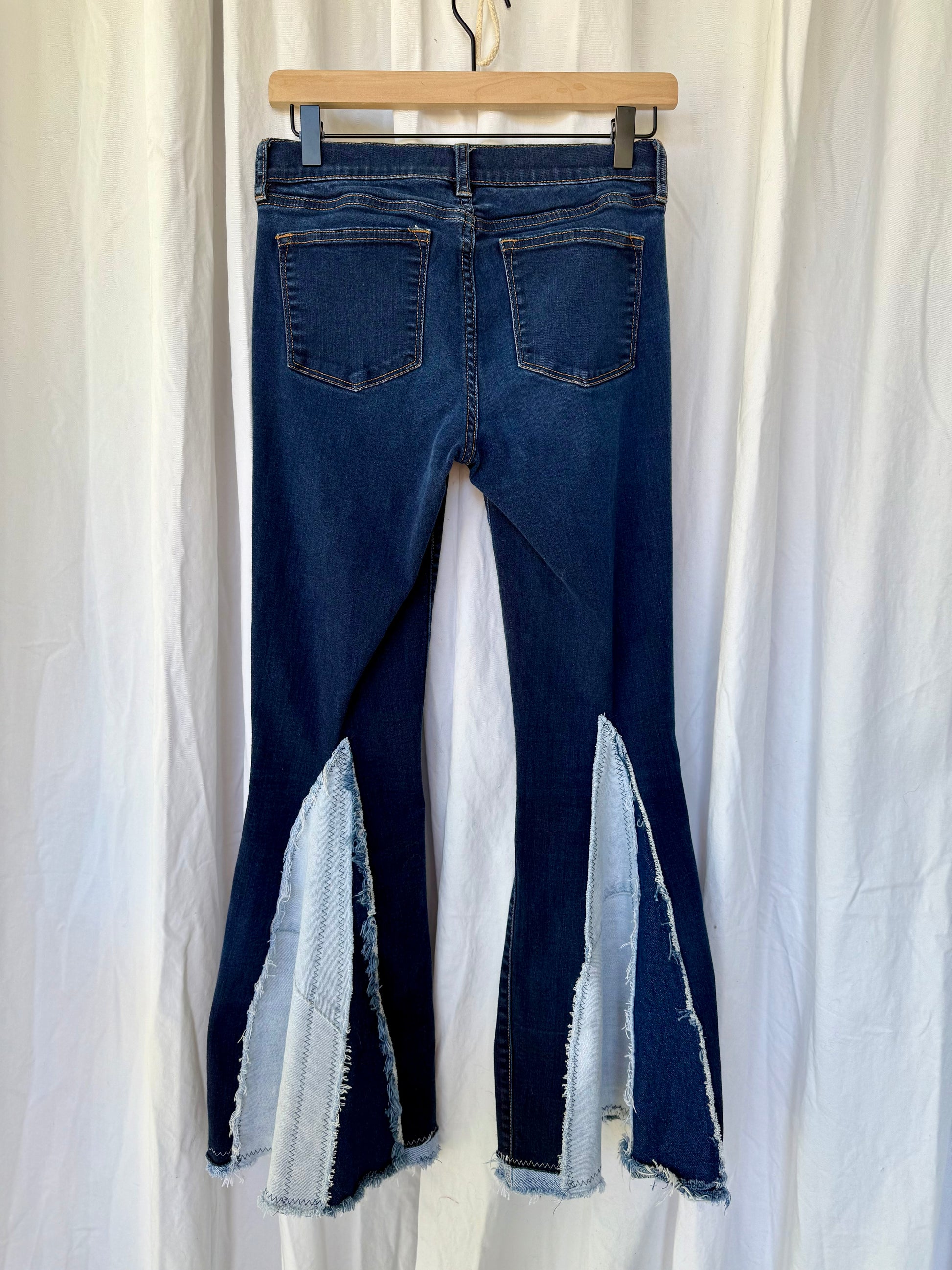 Denim-on-Denim Bell Bottom Jeans – Upcycled Two-Tone Flare with Frayed Seams | Vintage Inspired Boho Jeans (size 4)