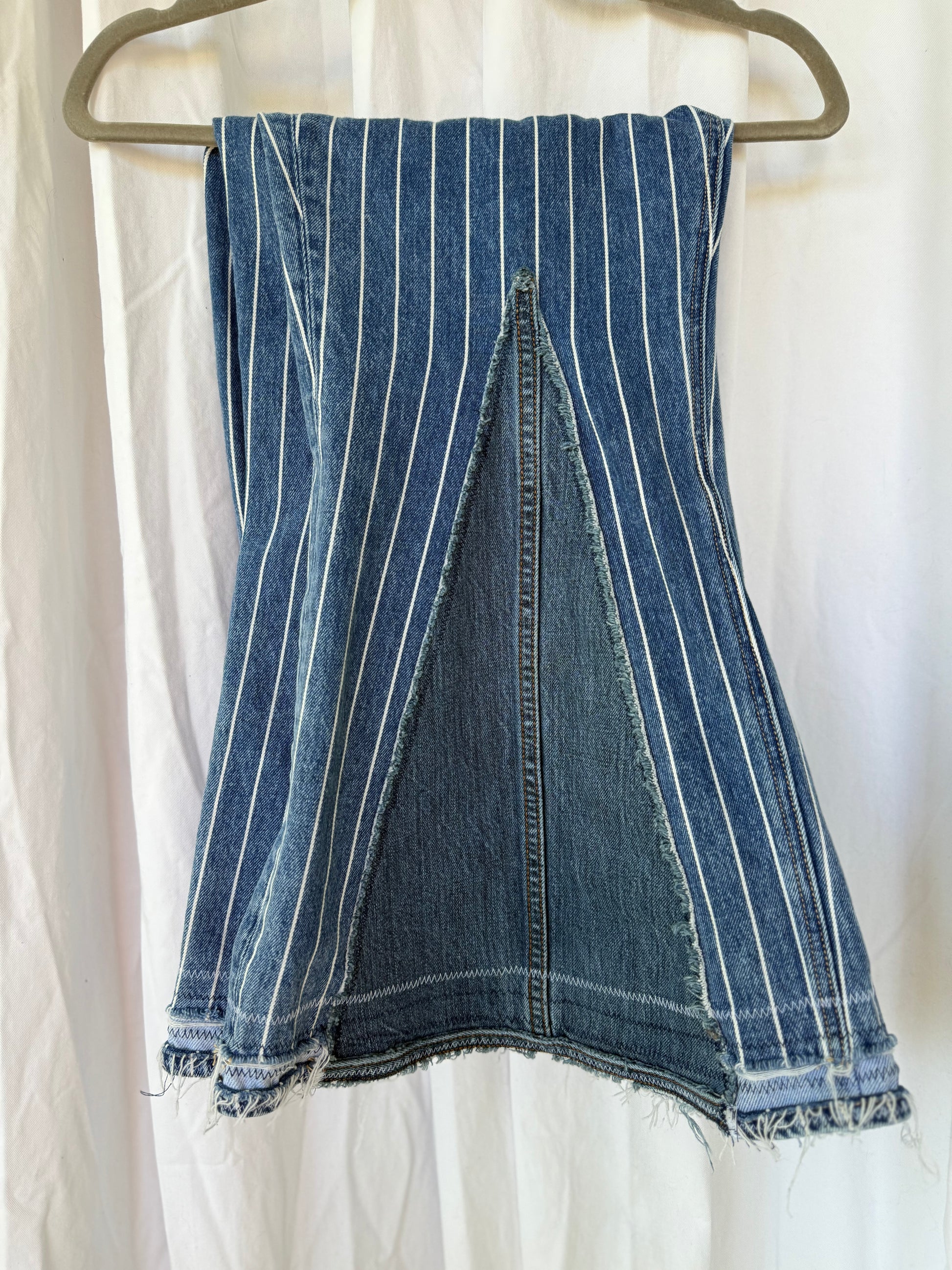 - Upcycled from multiple denim pieces for a unique pinstripe pattern