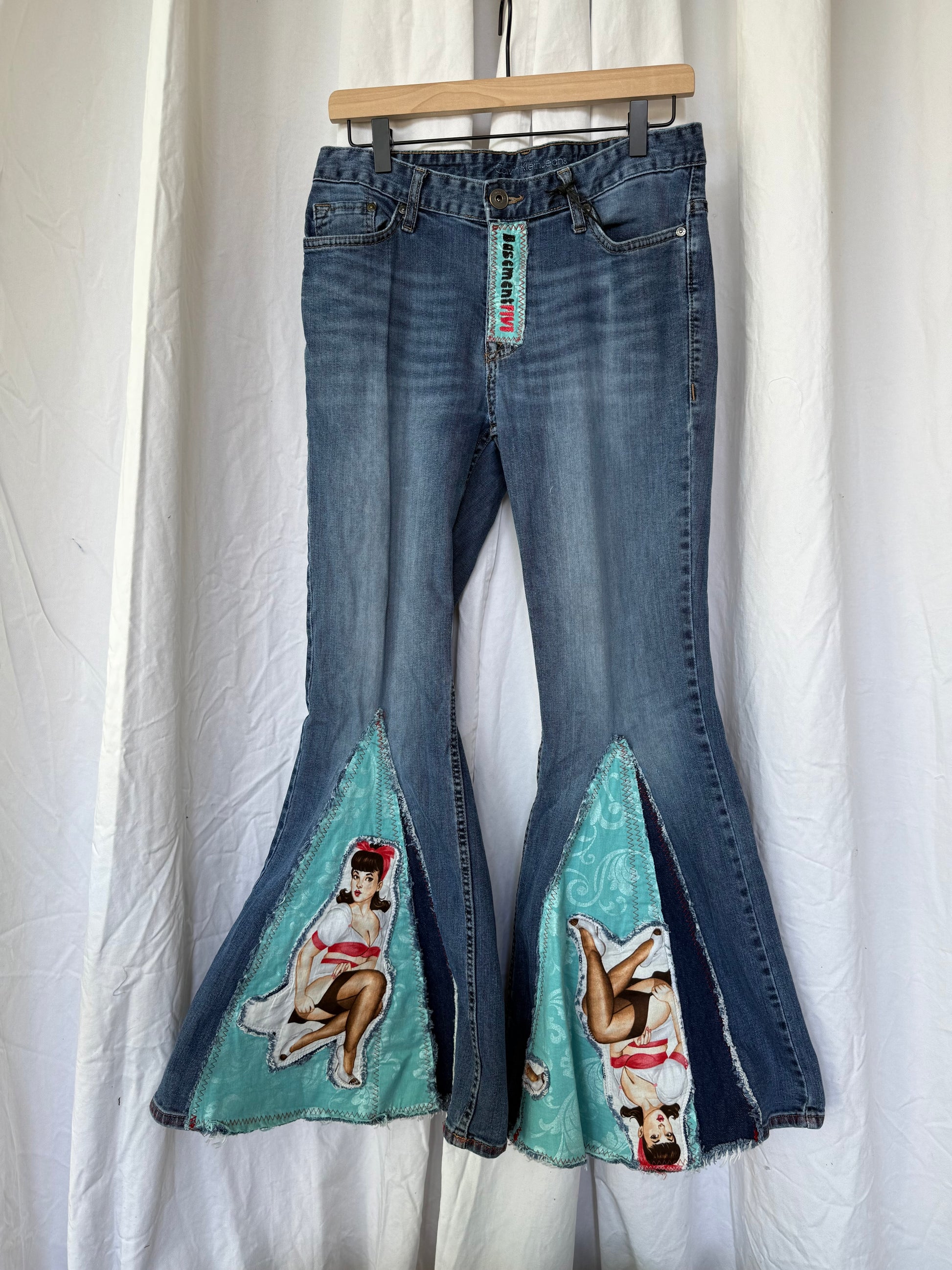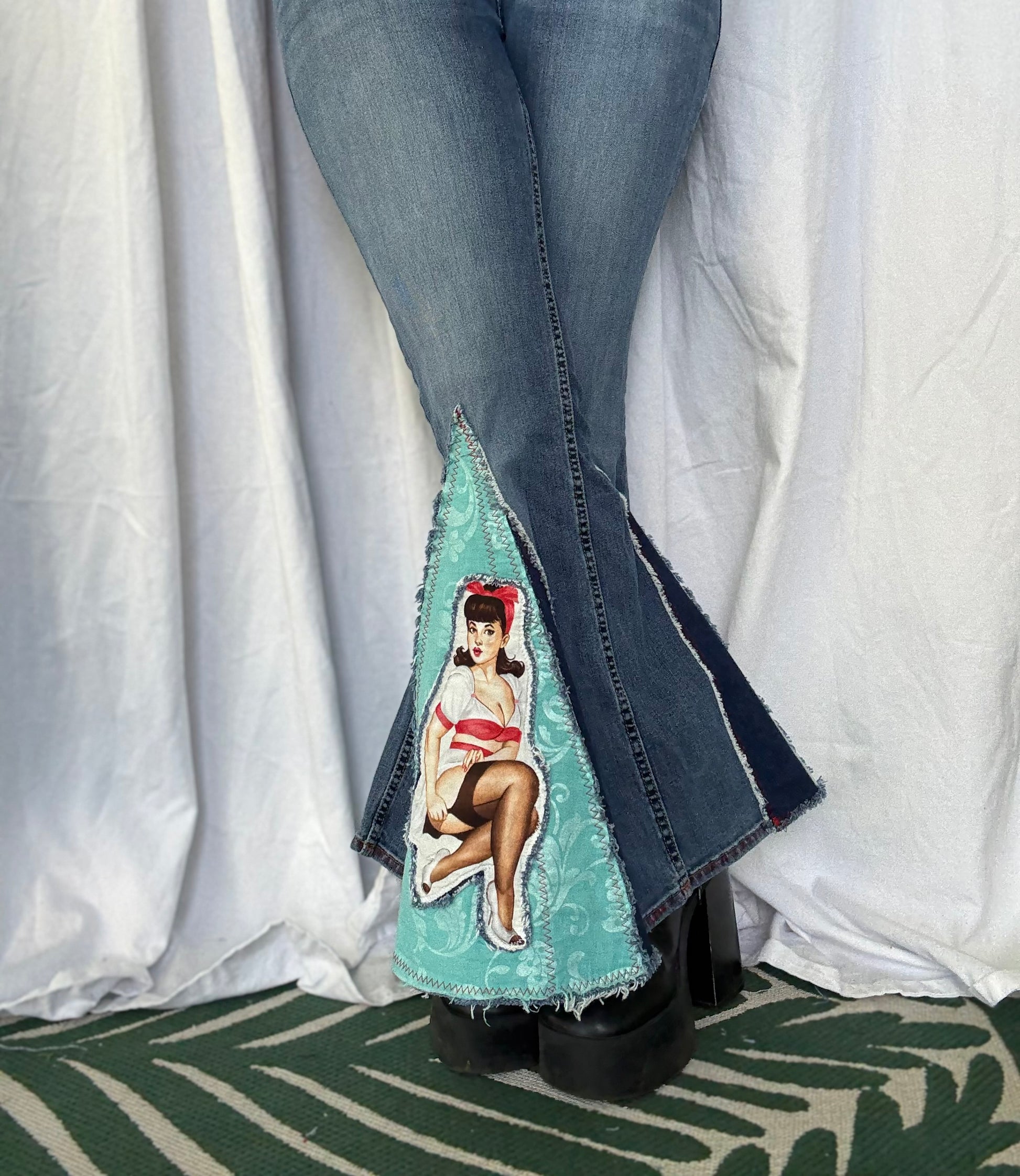Turn heads with these bold, one-of-a-kind upcycled bell-bottom jeans! Featuring stunning retro pin-up girl panels on vibrant turquoise fabric, these jeans bring a fun and flirty vintage vibe to any outfit. Perfect for festivals, concerts, or anyone who loves to make a statement with their style.