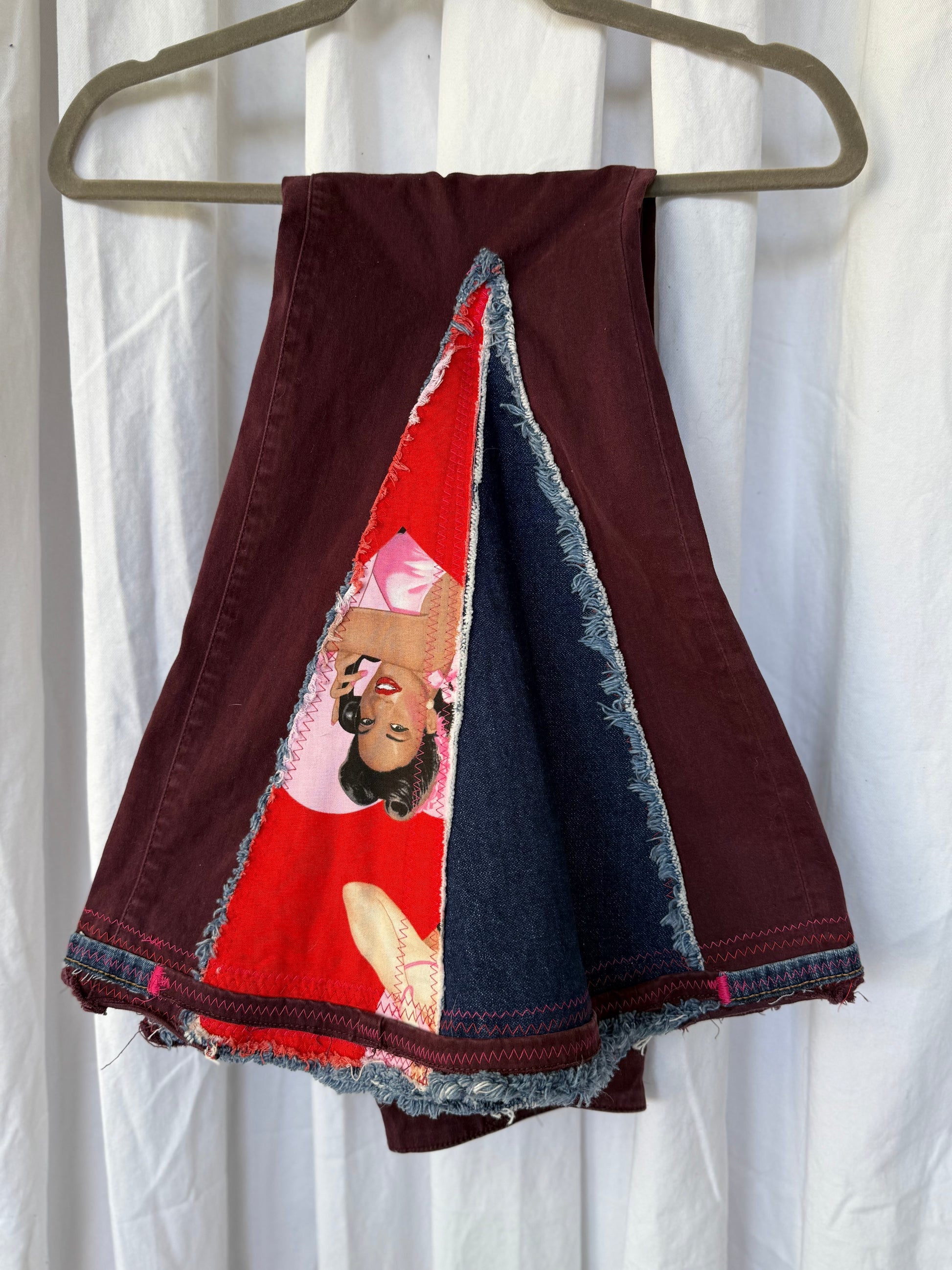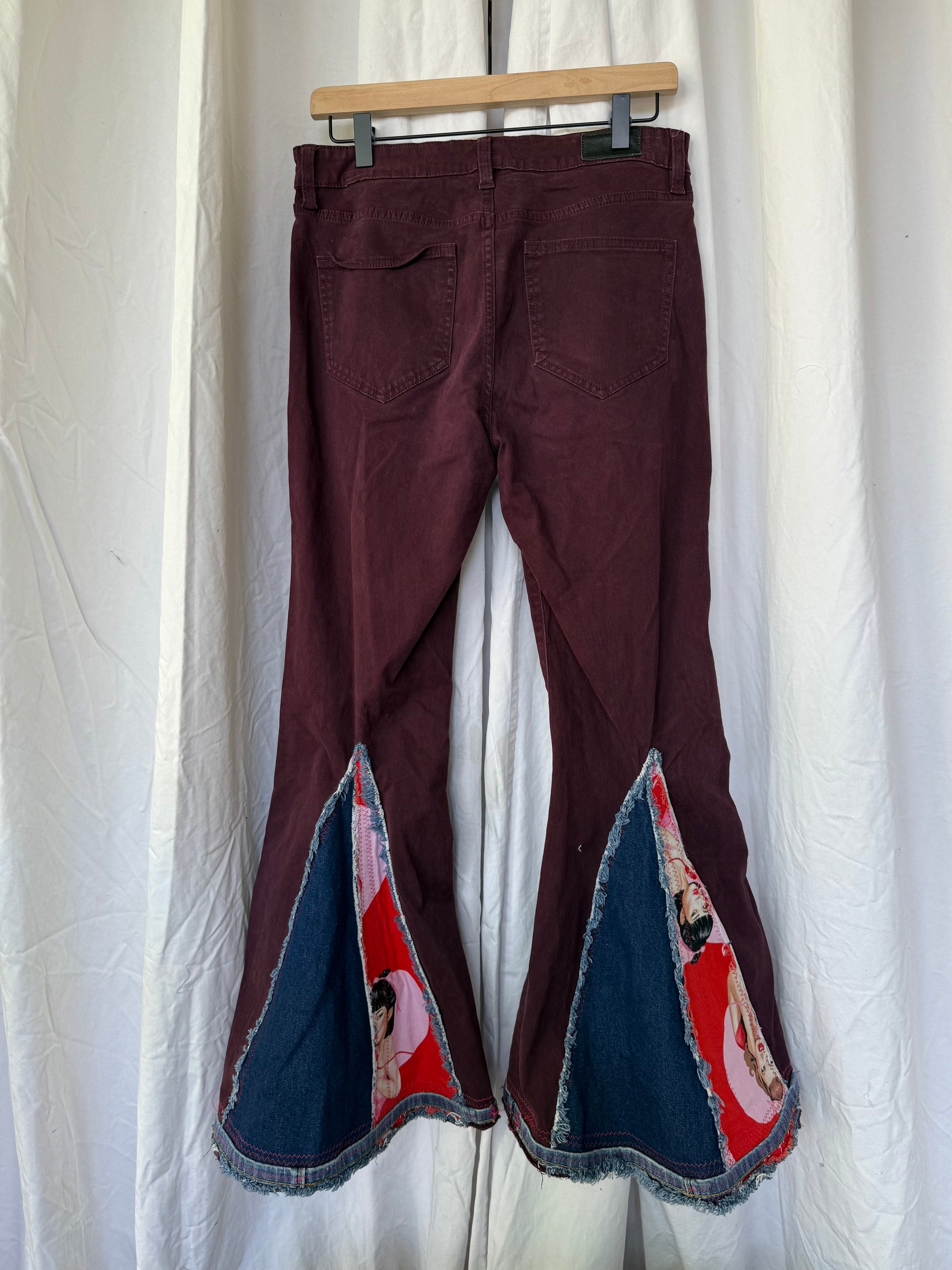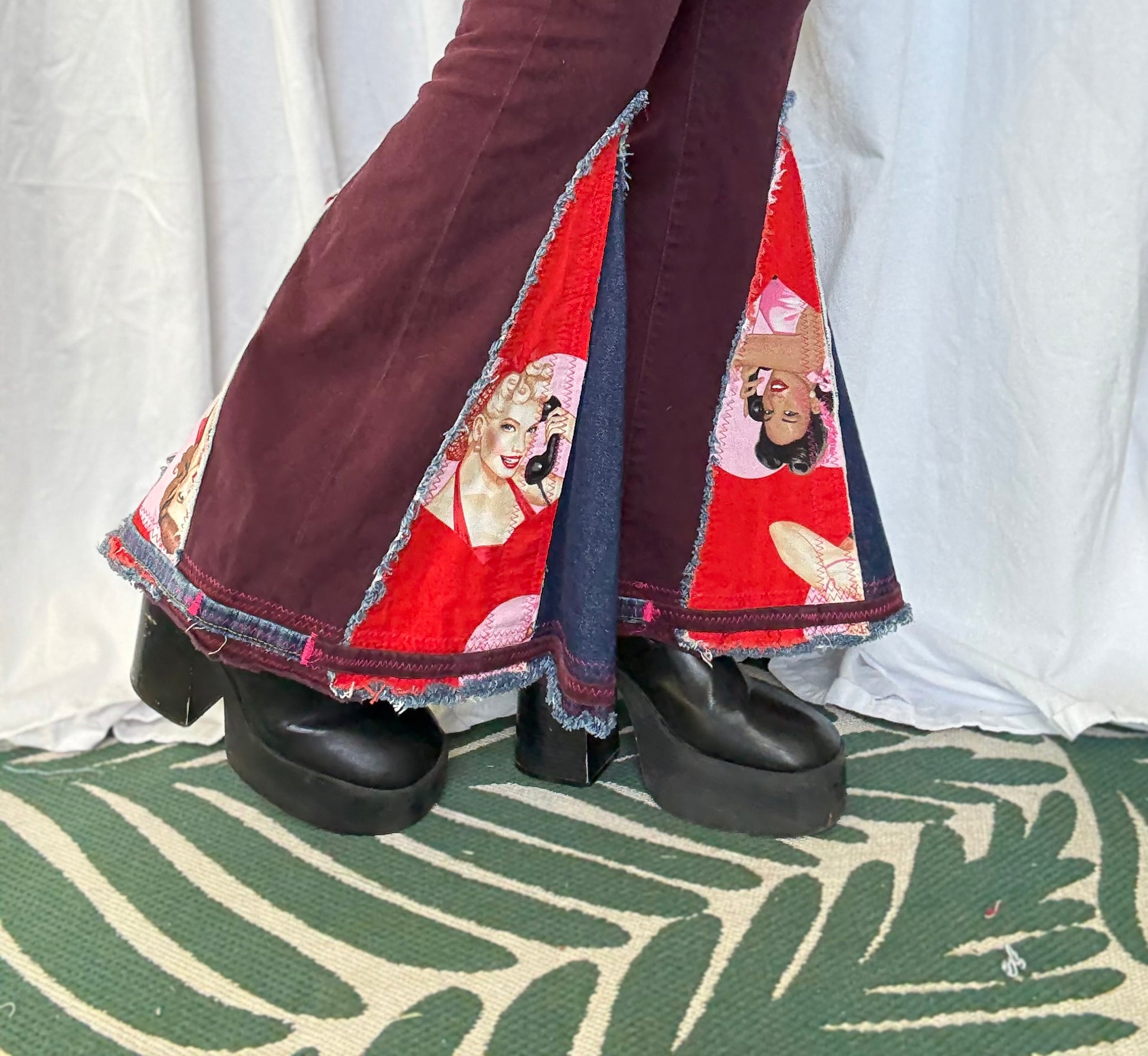 Turn heads with these bold, one-of-a-kind upcycled bell-bottom jeans featuring vintage-inspired pin-up girl panels. The rich burgundy base pairs perfectly with dark denim accents and vibrant red inserts, creating a striking retro glam look. These jeans are perfect for making a statement at concerts, festivals, or a fun night out.