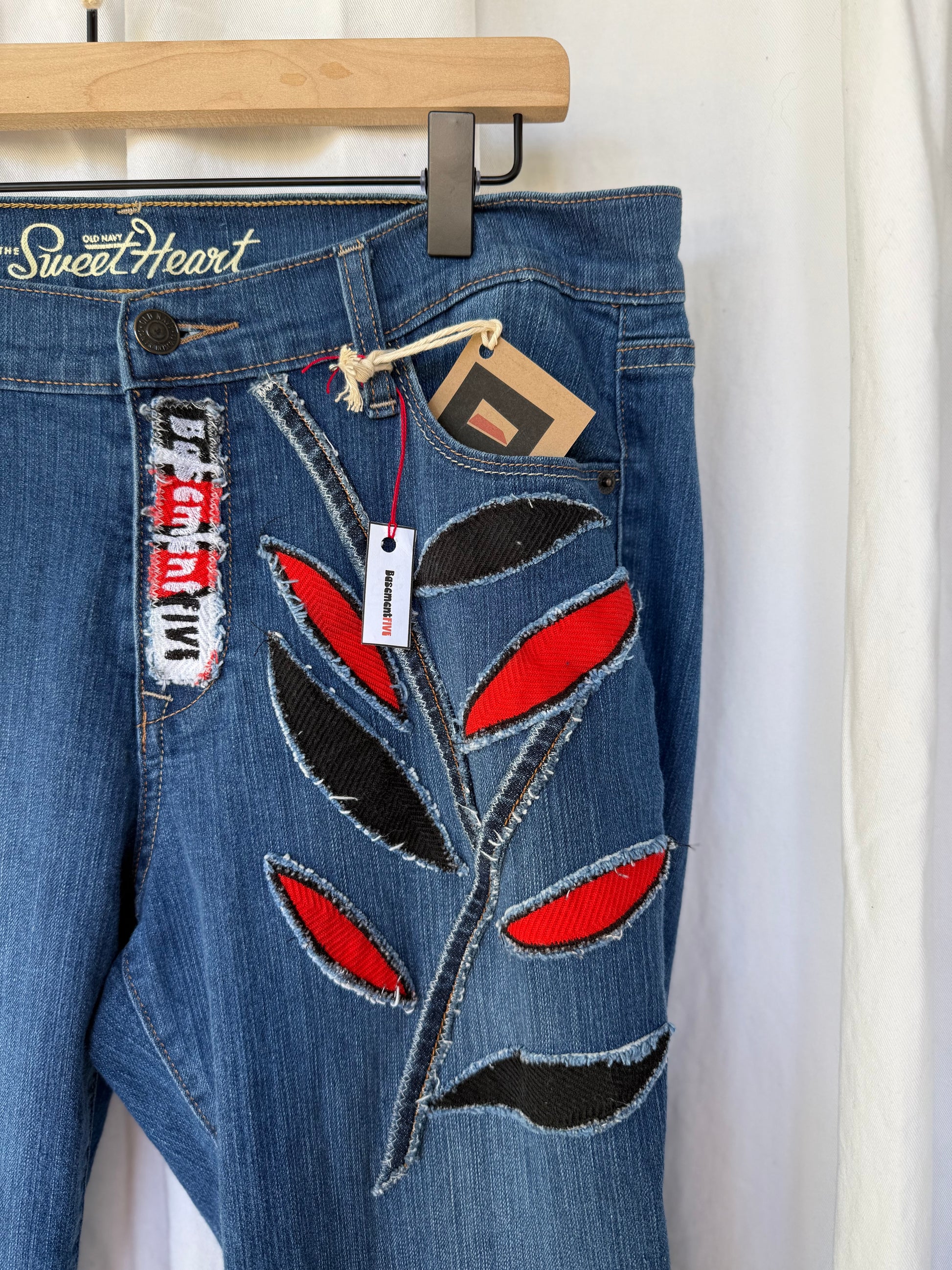 Make a fearless statement in these handmade bell bottoms — a perfect mix of retro flair and modern edge. Upcycled from pre-loved denim, this pair features bold red and black leaf appliqués along the hip and dramatic bell inserts in a vibrant red-and-black leaf print. The contrast stitching and raw hems give them that perfectly undone, one-of-a-kind vibe.