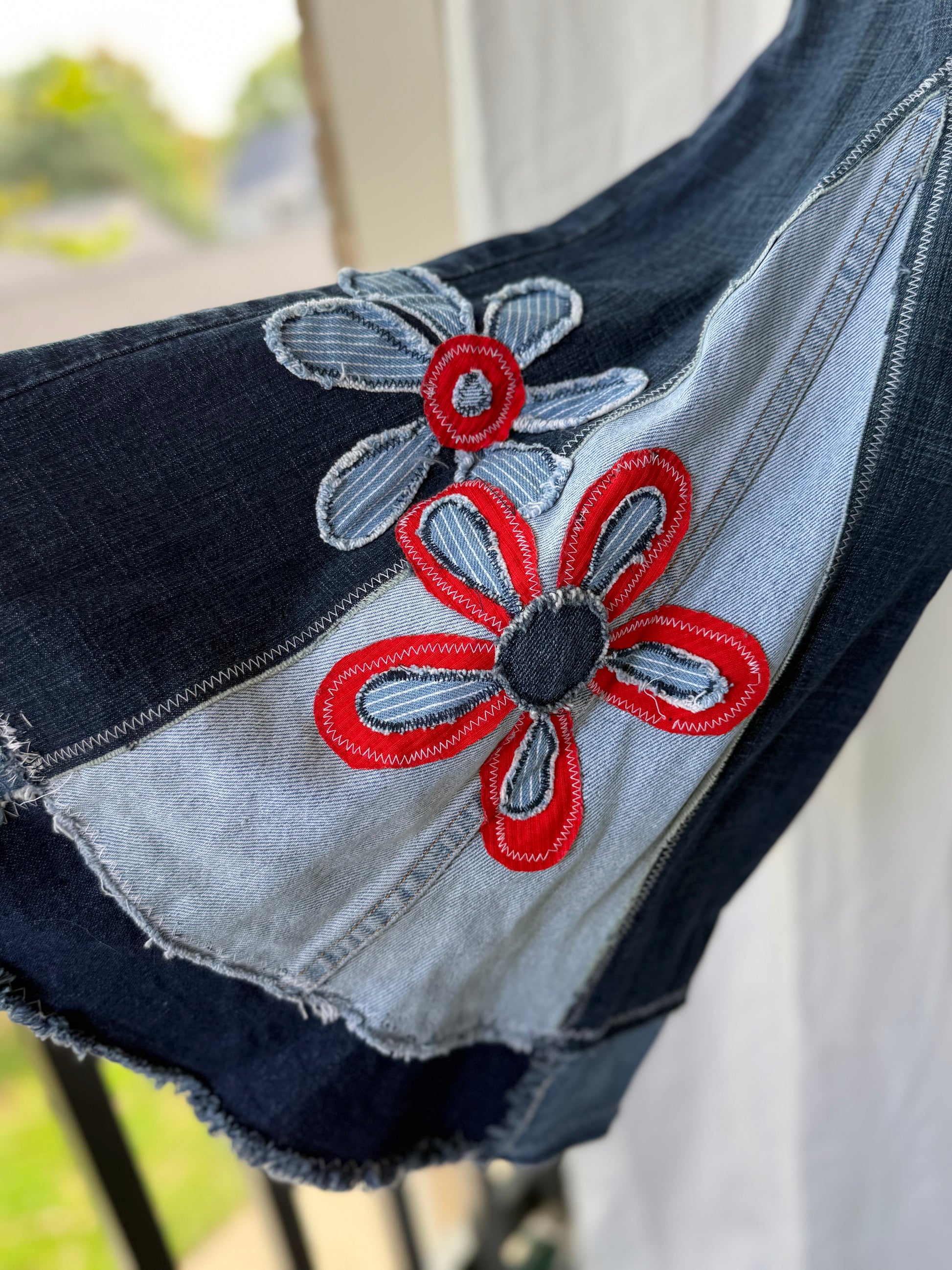 - Flower Power Design: Bold red and denim appliqué flowers with stitched leaf details