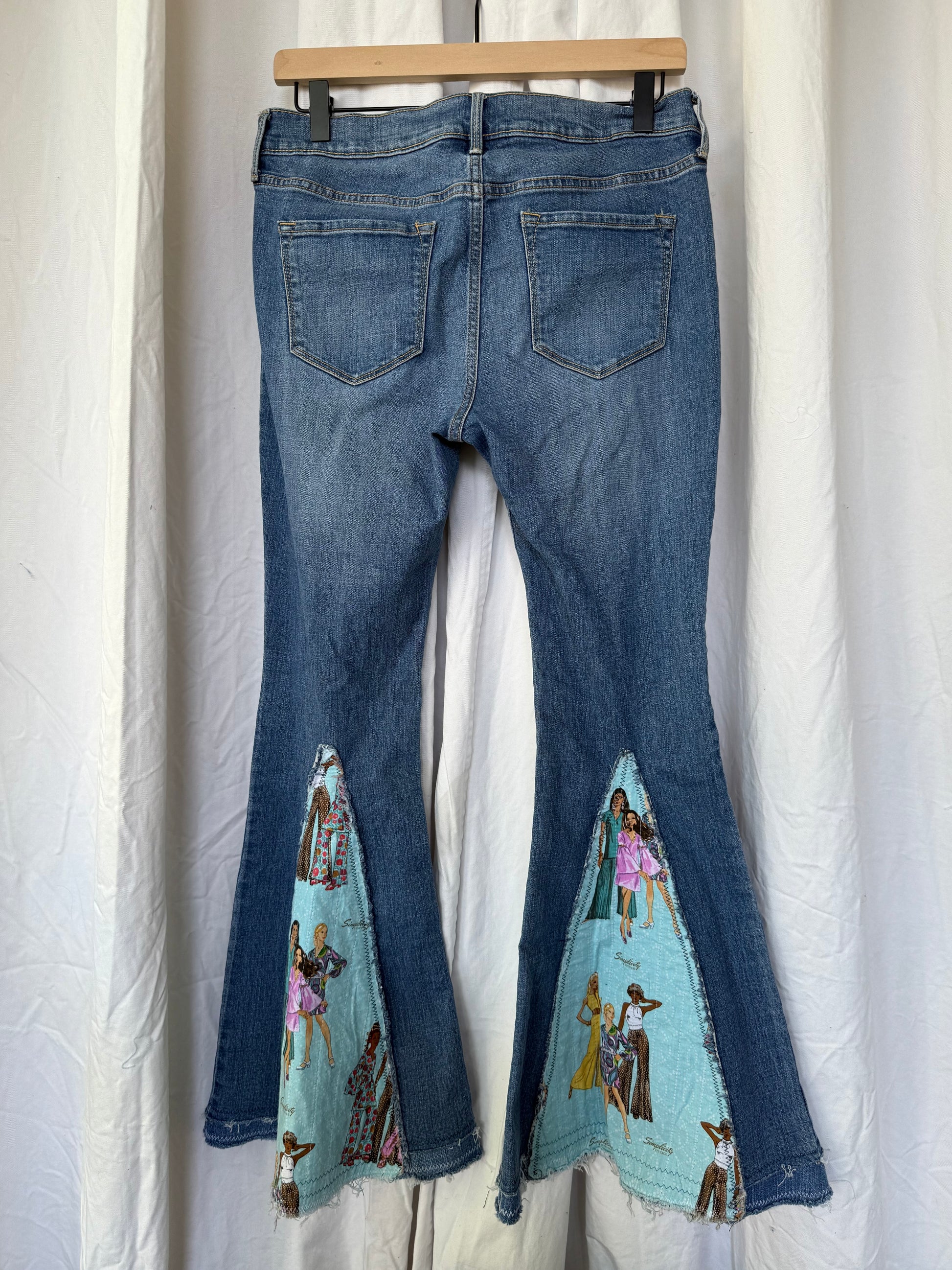 Make every sidewalk your runway with these one-of-a-kind upcycled bell-bottom jeans! Featuring light blue inserts with vintage fashion illustrations, these jeans celebrate timeless style and individuality. Perfect for fashion lovers, art enthusiasts, or anyone who dares to stand out with bold, sustainable fashion.