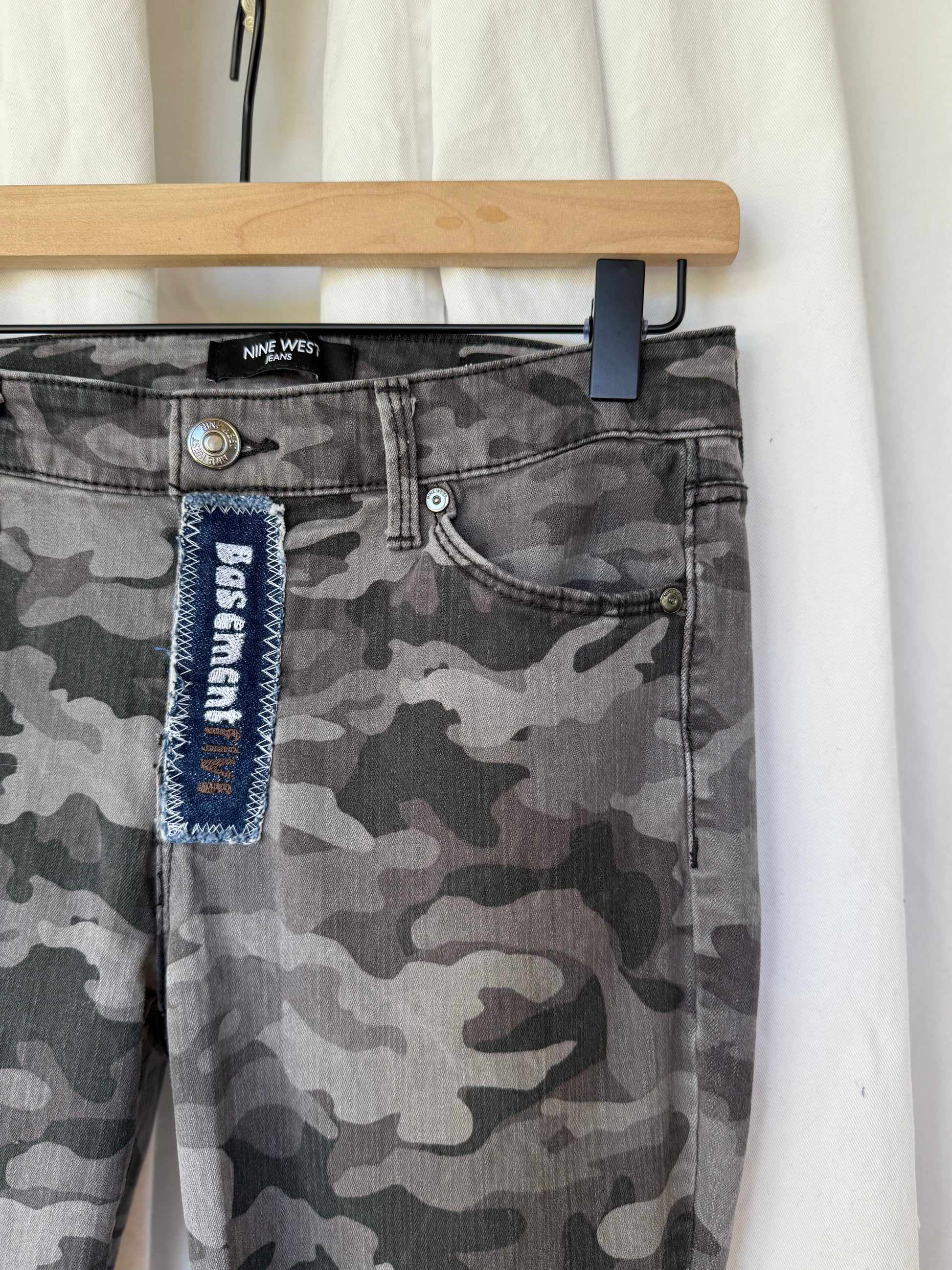 Stand out with these one-of-a-kind camo bell bottoms, handmade for those who love bold, edgy style with a touch of retro flair. Starting with a pair of camo (Nine West denim) skinny jeans, these have been transformed with dramatic denim patchwork flares, combining military-inspired style with 70s festival vibes. (27x29)