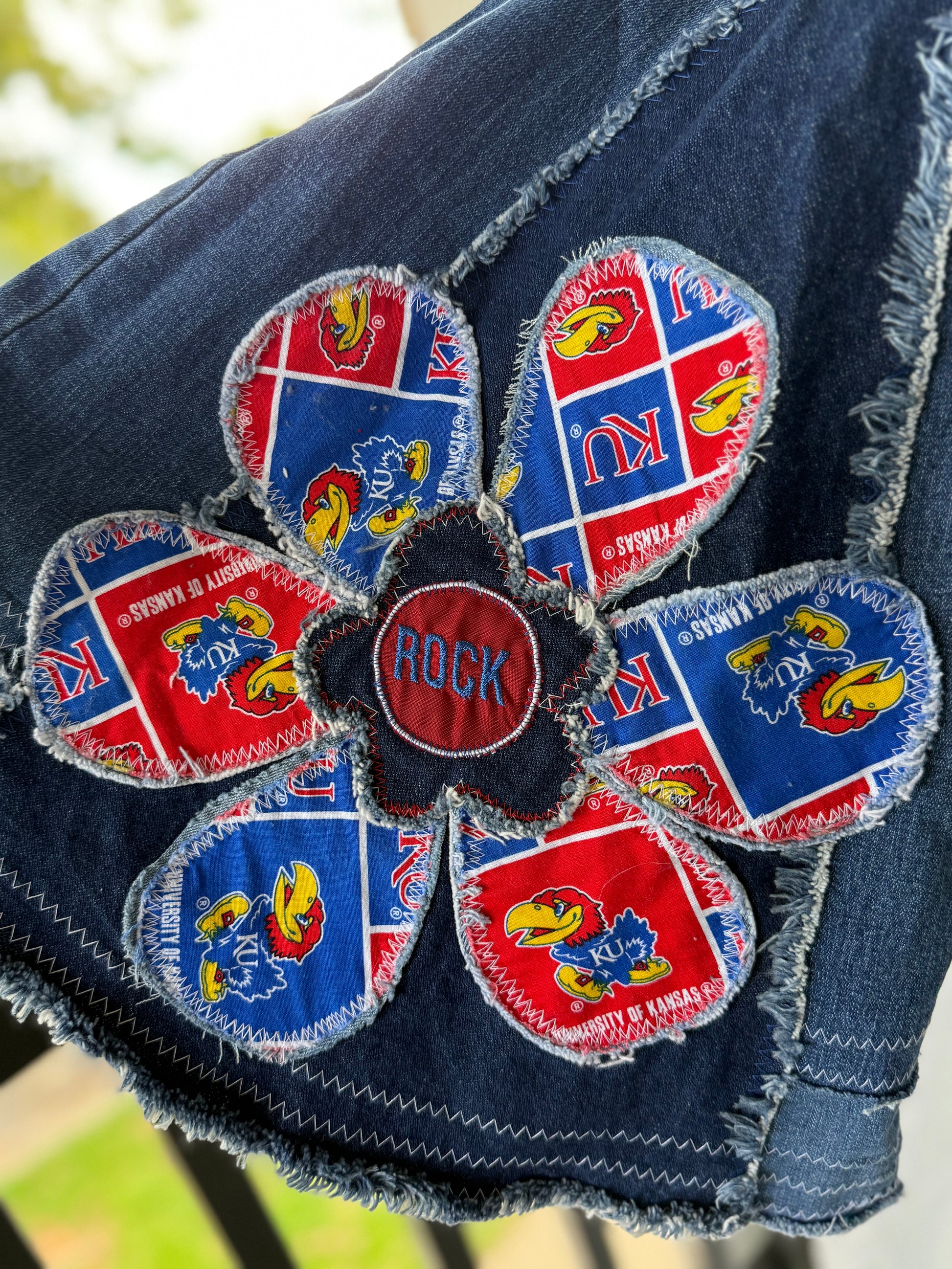 • Jayhawks Patchwork Flowers: Large, colorful appliqué blooms crafted from KU fabric with raw edges for a rugged, rock-inspired look