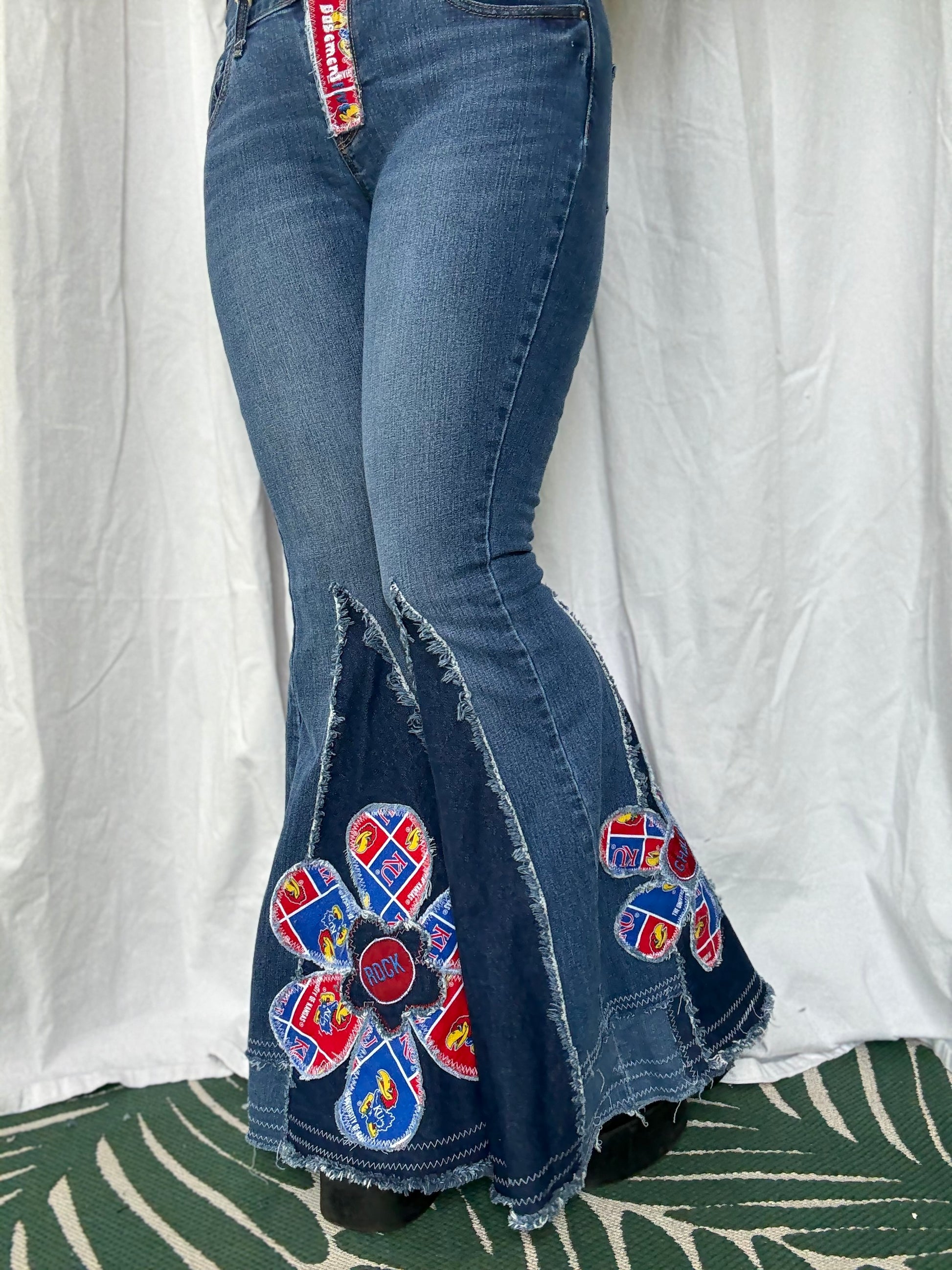 Step into bold, one-of-a-kind style with these handmade upcycled bell-bottom jeans! Featuring denim inserts and oversized patchwork flowers made from KU Jayhawks fabric, these jeans are a true statement piece for fans who love to stand out. Perfect for game days, concerts, or everyday wear when you want to show team pride with a retro-rock edge. (29x32)
