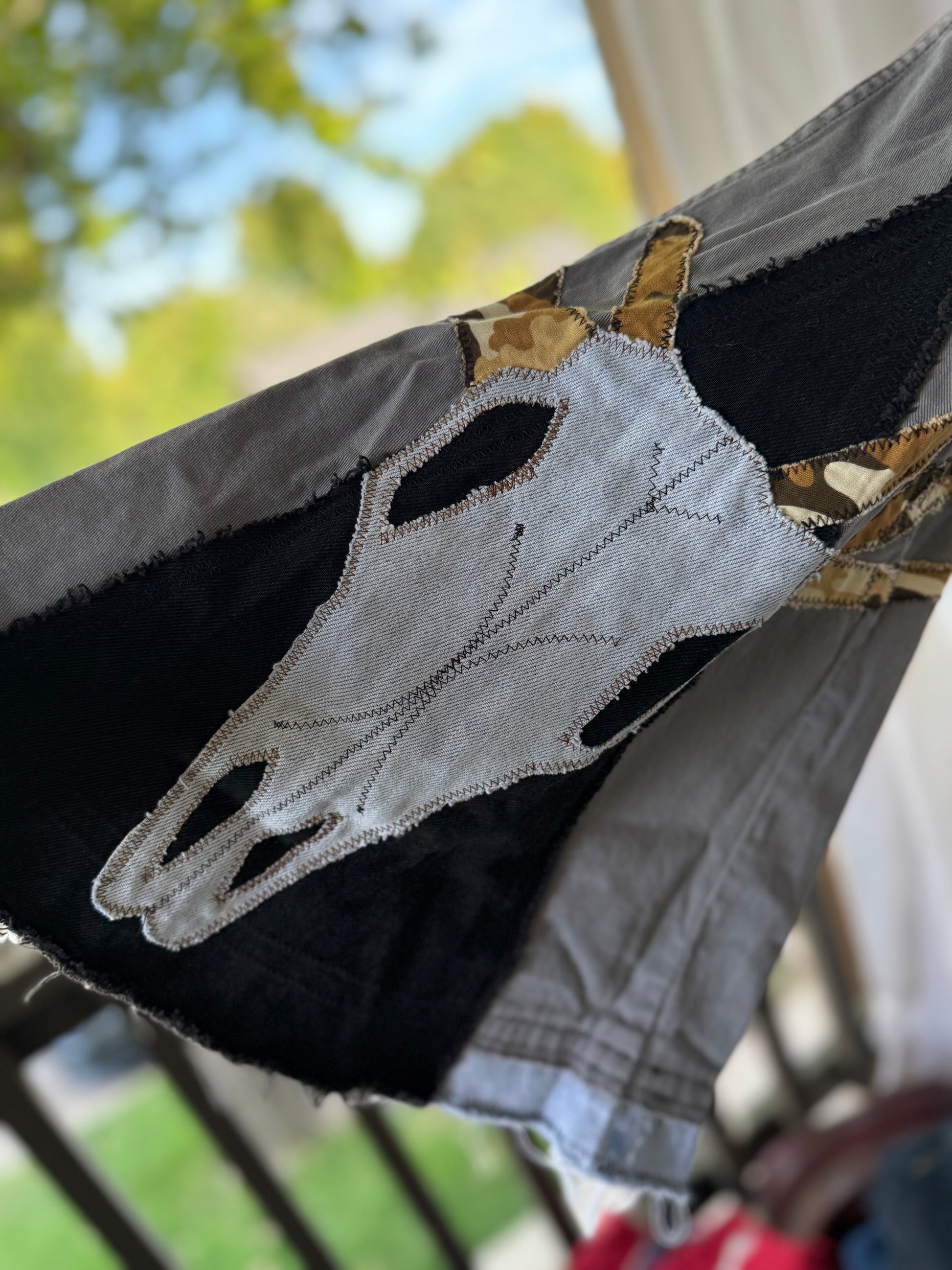 - Hand-appliquéd skull and camo antlers for a bold statement