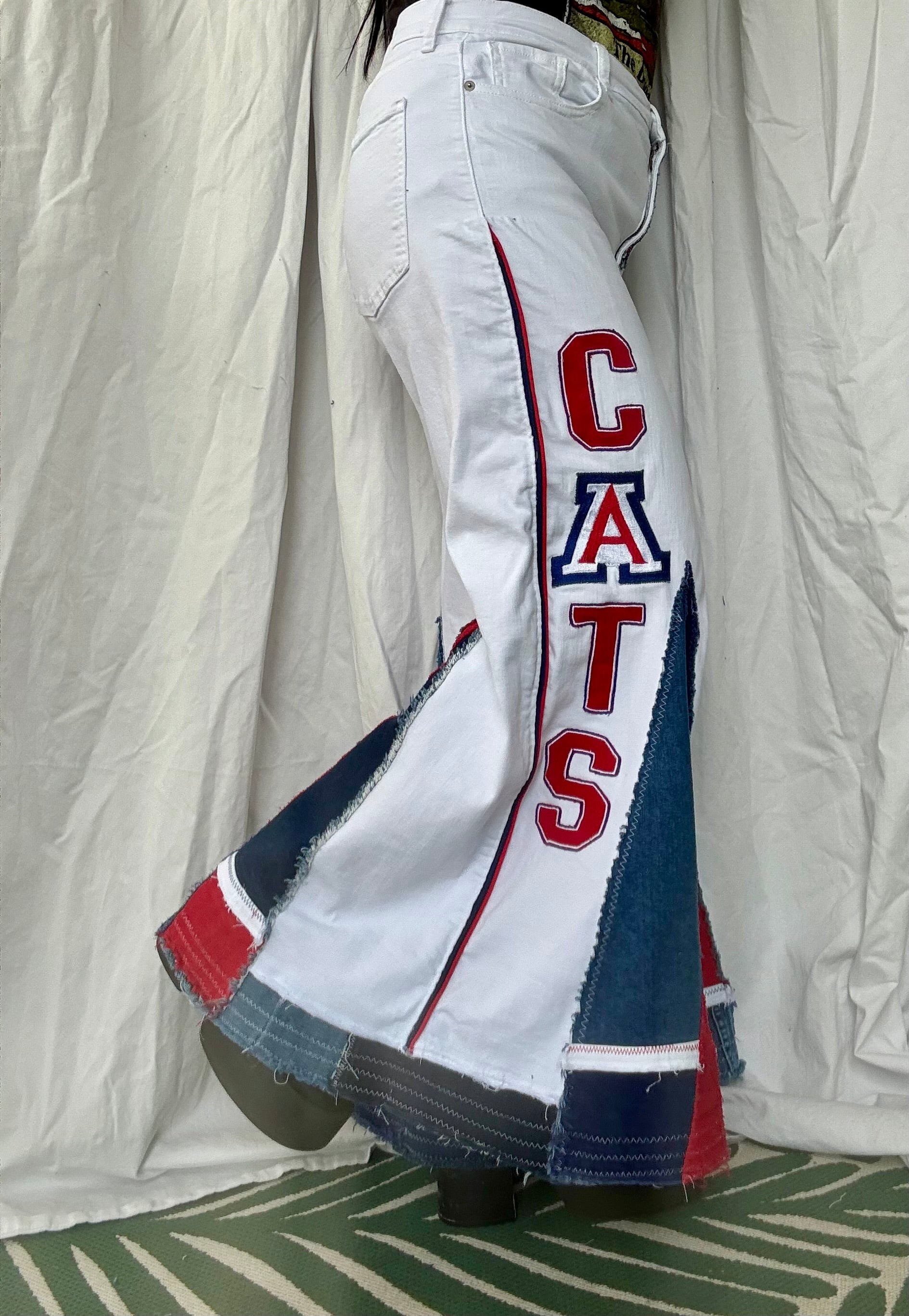 Turn heads and show your spirit in these one-of-a-kind Wildcat Pride bell bottoms. Handmade from upcycled white denim, this statement pair fuses retro 70s energy with bold, collegiate flair. Each leg features deep denim and scarlet red inserts that explode into wide, dramatic flares, finished with raw edges and layered topstitching for a perfectly deconstructed look.