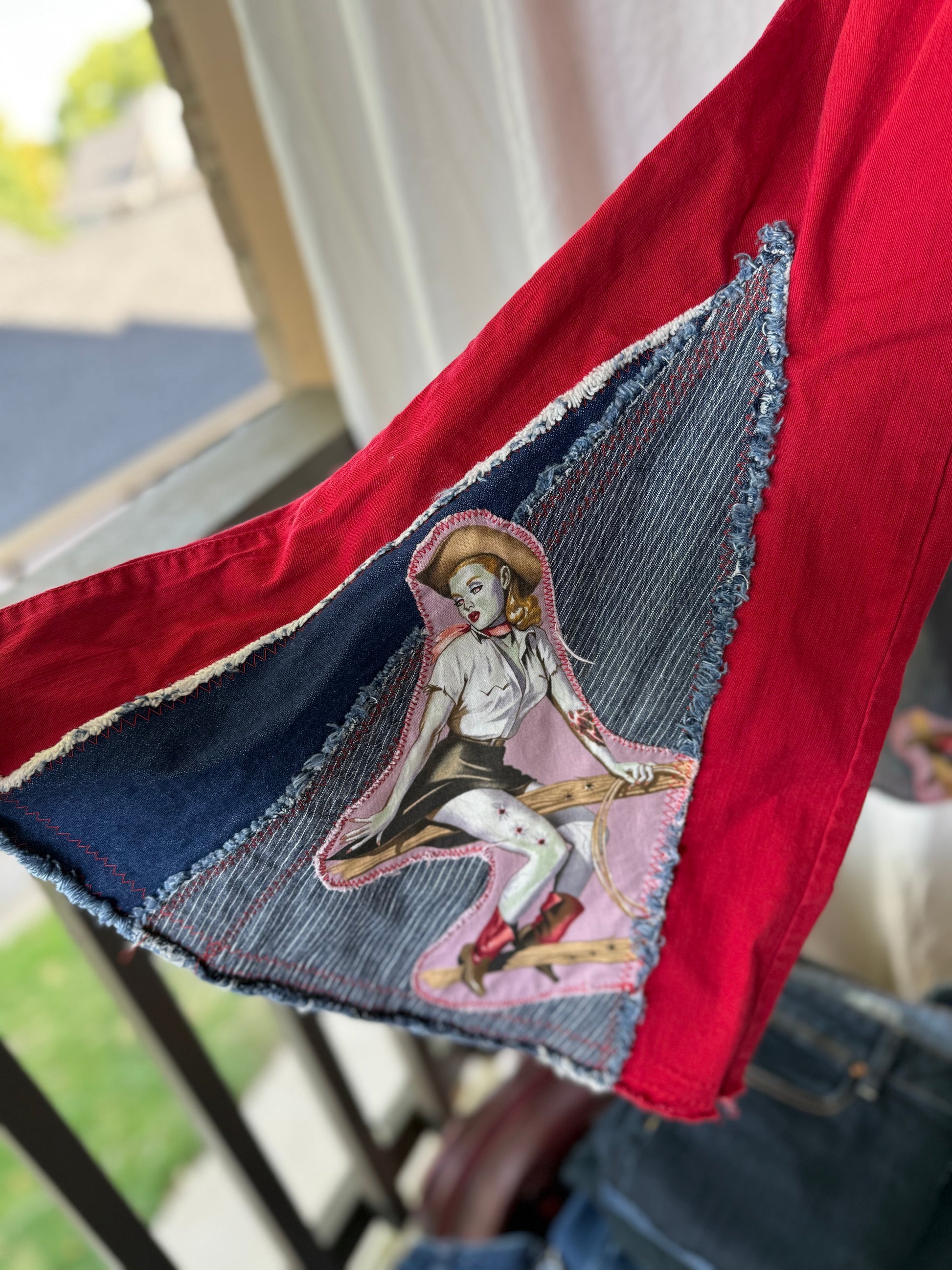 Vintage Zombie Cowgirl Upcycled Bell Bottom Jeans (size 6)– Red Western Flare Pants